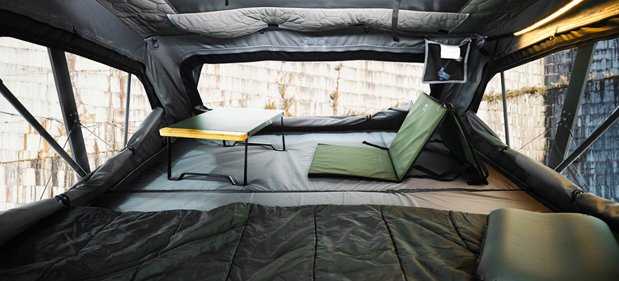 Cette tente de toit hybride est équipée d'un matelas 4 cm d'épaisseur ainsi que d'un matelas en maille 3D anti-condensation, offrant une expérience de sommeil confortable. Un ruban LED vient compléter l'ensemble, ainsi que deux filets de rangement et les pochettes à chaussures accessibles de chaque côté de l'entrée.